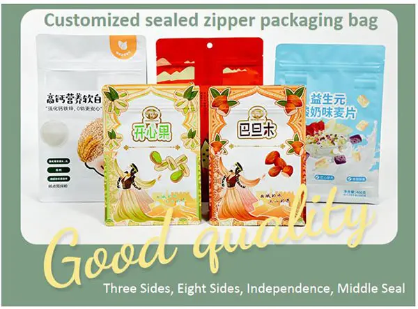 ● Jinde Packaging Company is a zipper bag manufacturer that supports various customized specifications of sealed zipper packaging bags, including three sides, eight sides, self-supporting, and middle sealing.etc.